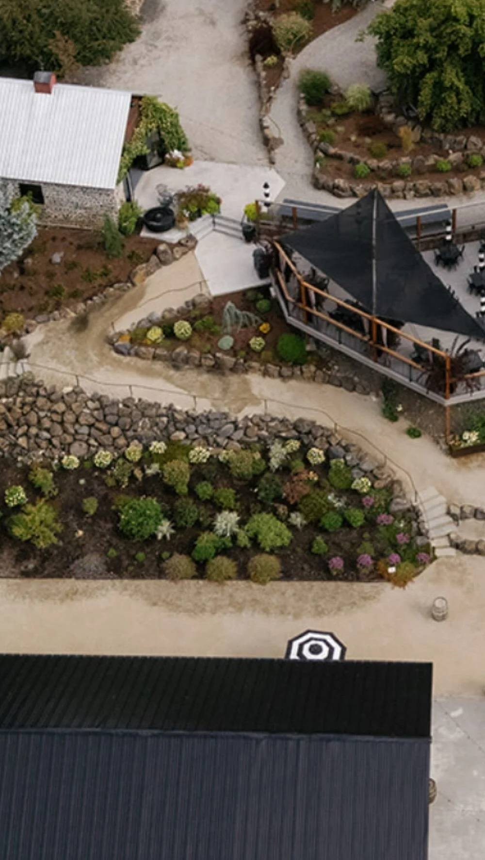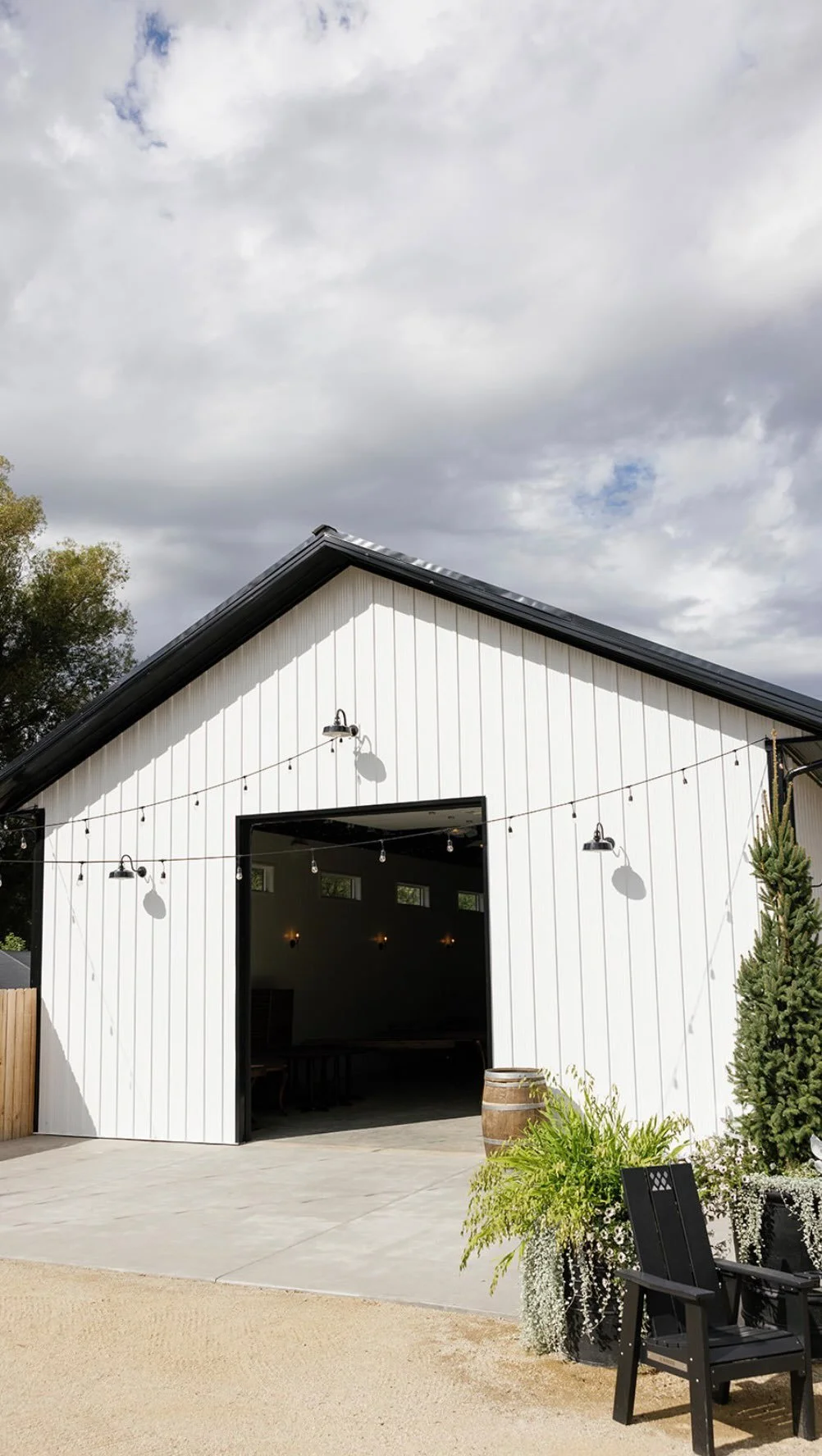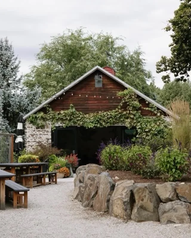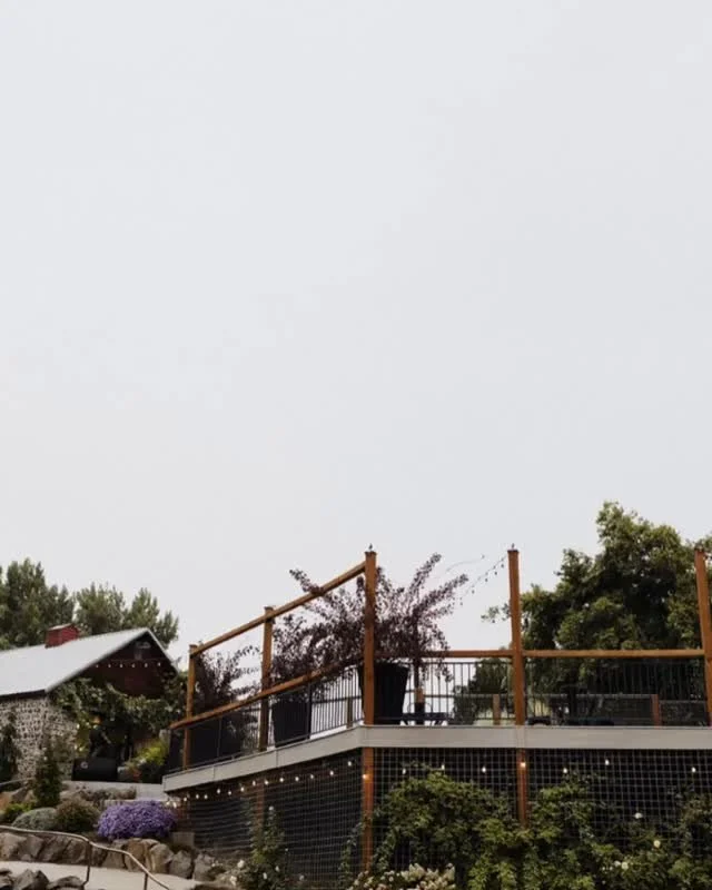 Our new barn is beautifully surrounded by landscaped gardens a courtyard with fire pit and yard games. It is cozily nestled below The Quail, Deck & original 1915 barn. It boasts an open white interior with twinkle lights and custom floral chandeliers, creating a perfect romantic setting for you to personalize for your special day.